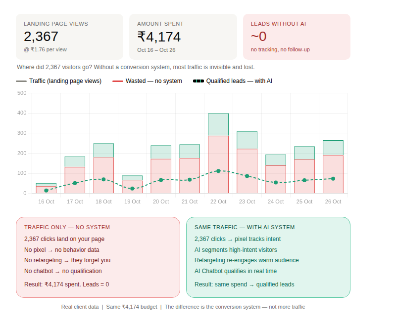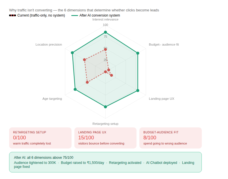 Yes — often significantly so. If your current traffic converts at a very low rate, improving your pixel setup, enabling behavior-based retargeting, and deploying an AI chatbot funnel can generate substantially more qualified leads from your existing spend. Our client case study showed the same ₹4,174 budget producing near-zero leads before the system, and measurable qualified leads after.